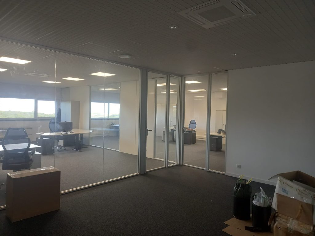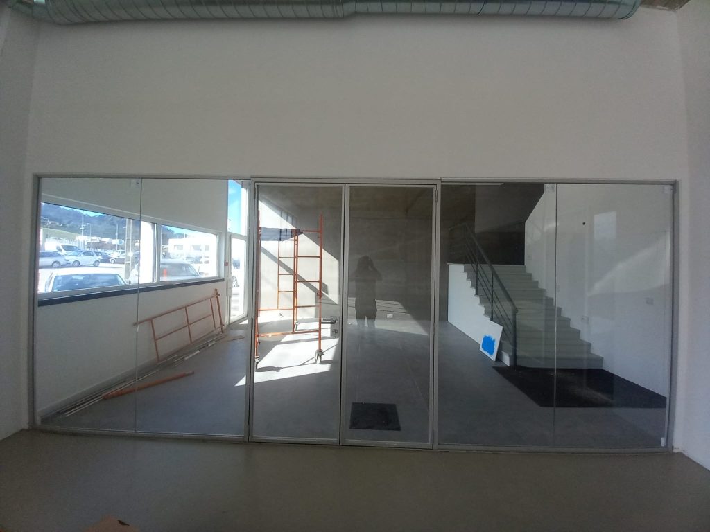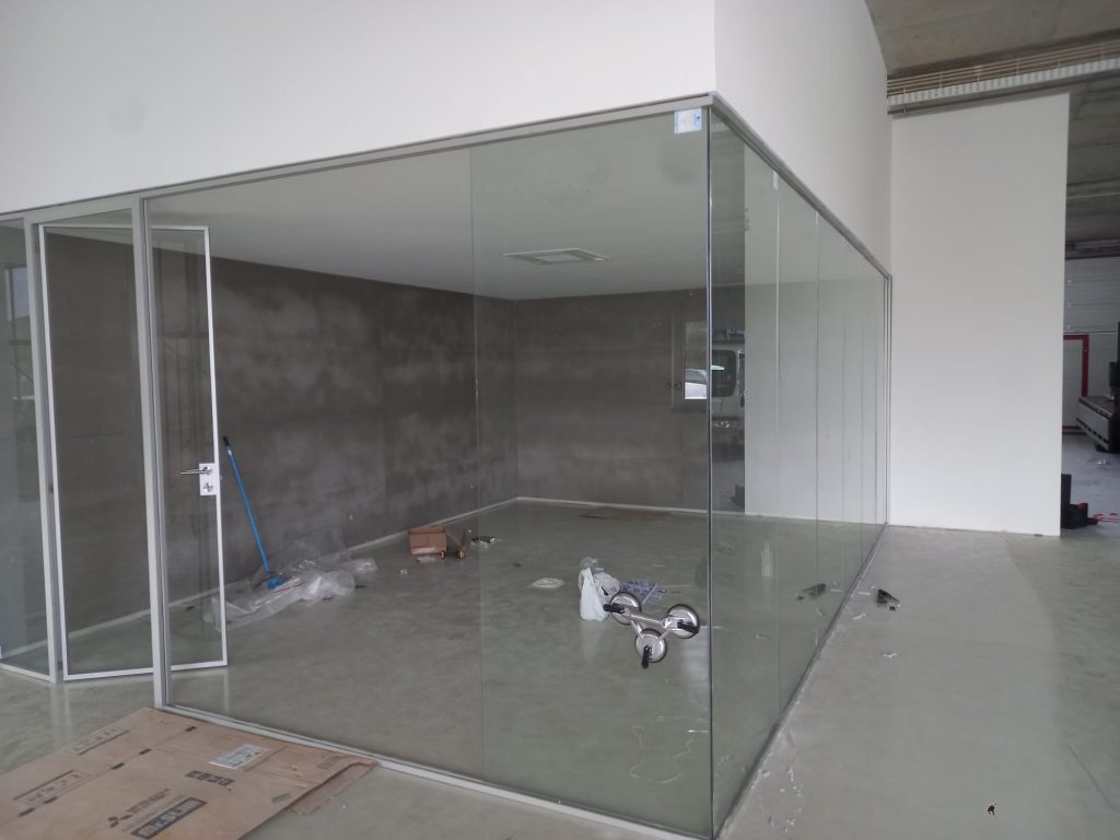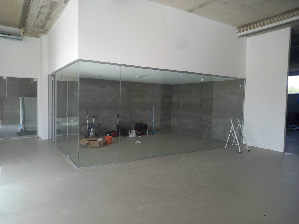 Divisórias em vidro laminado e perfil de alumínio minimalista marca Funcional
